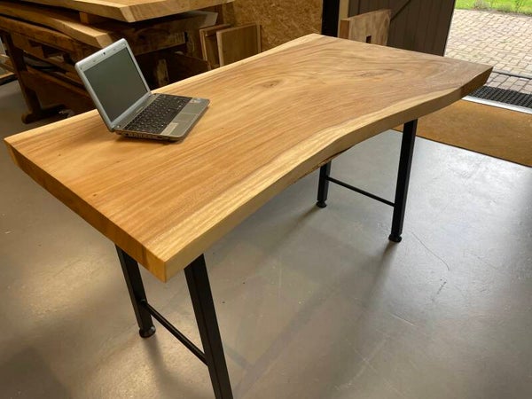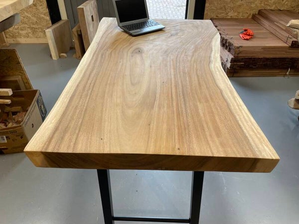 Deze tafel, bureau, is van 1stuk Suar hardhout en is 7cm dik. en totaal 83cm hoog en staat op zwart stalen poten