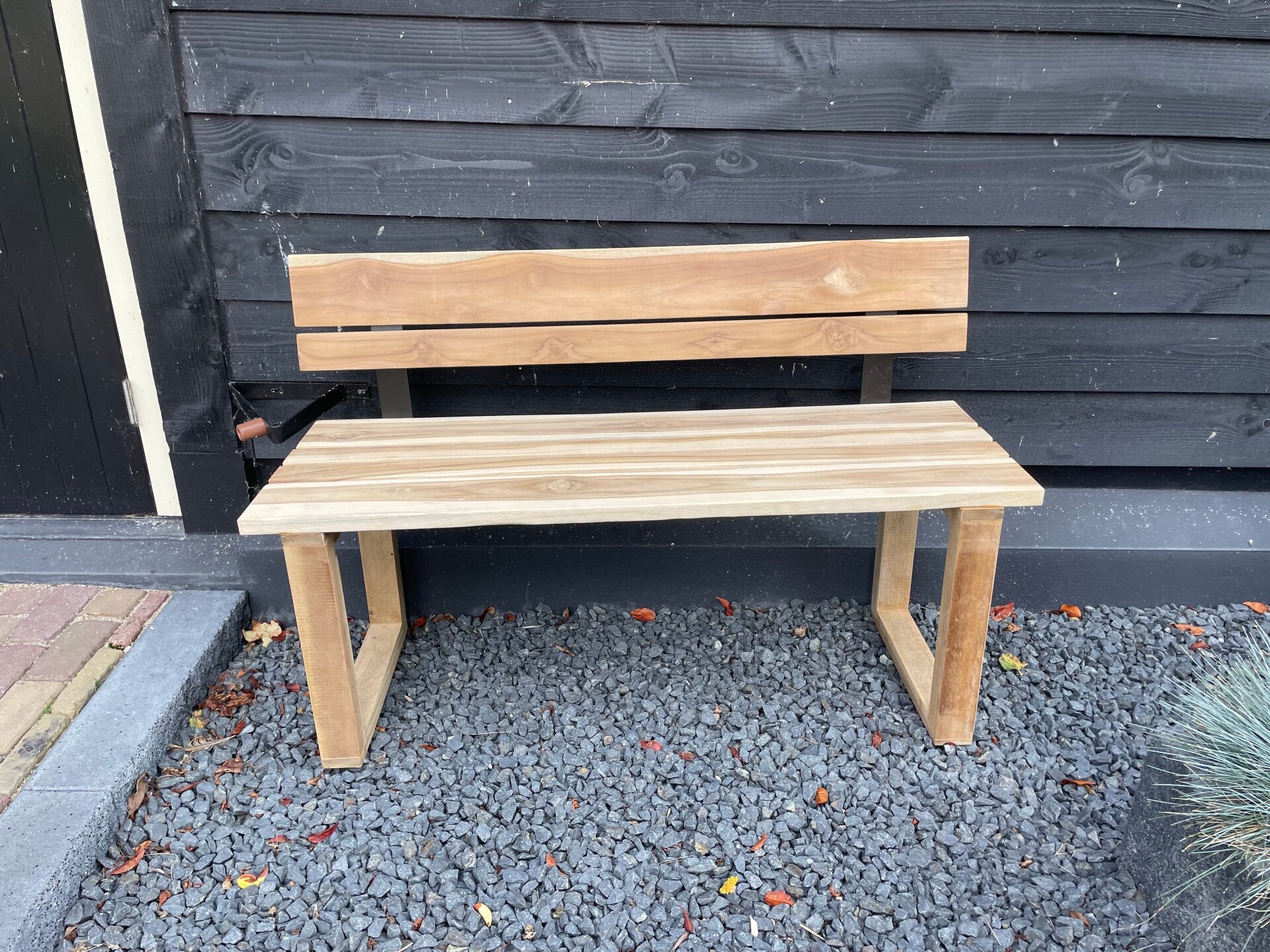 Deze Tuinbank staat op hardhouten poten en heeft prachtige teakplanken van 28mm dik als zitting en rugleuning .