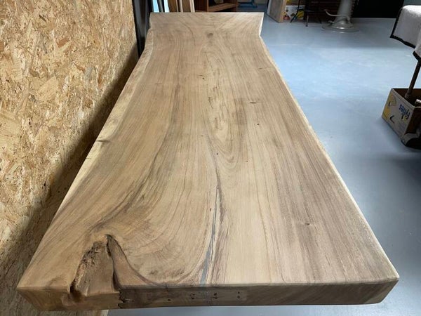 Het blad is fijngeschuurd en spiegelglad, je kunt er zelf nog alle kanten mee op, tafel, bureau, salontafel, sidetable etc. Indien gewenst zagen we het blad voor je op maat.