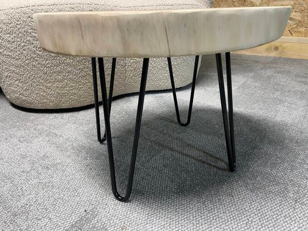 Het blad is 6cm dik en staat op zwarte hairpinpoten, totale hoogte van 36cm