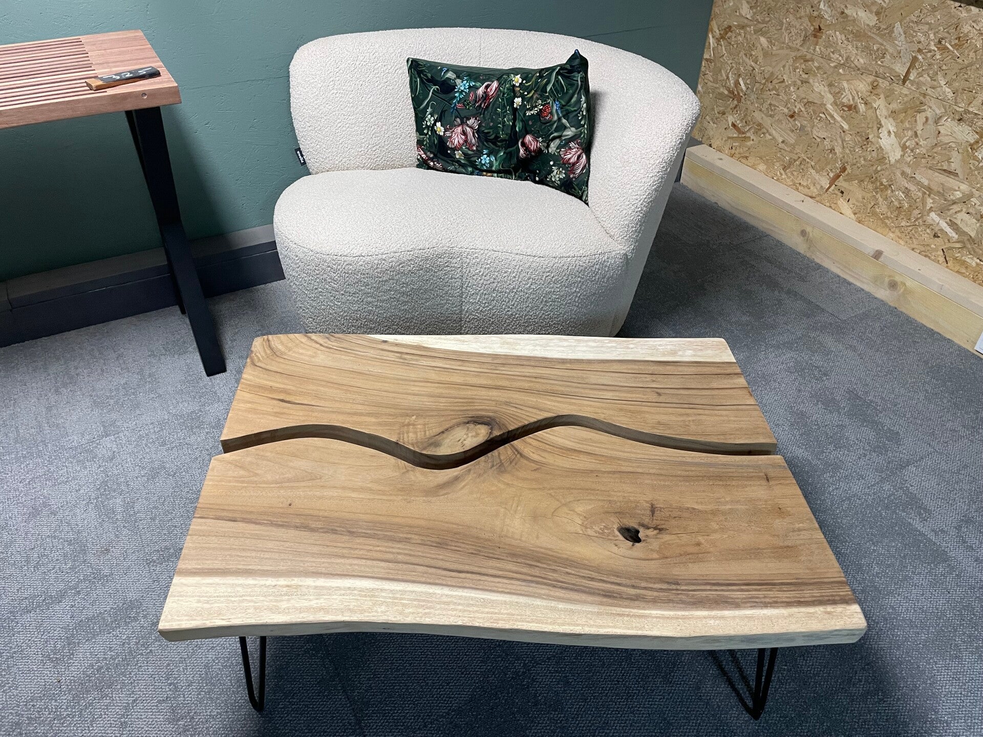 Deze set van Suar hardhout is 6cm dik Ze staan op zwarte hairpinpoten, van totaal 36cm maar kan ook op 26cm of 47cm gezet worden.