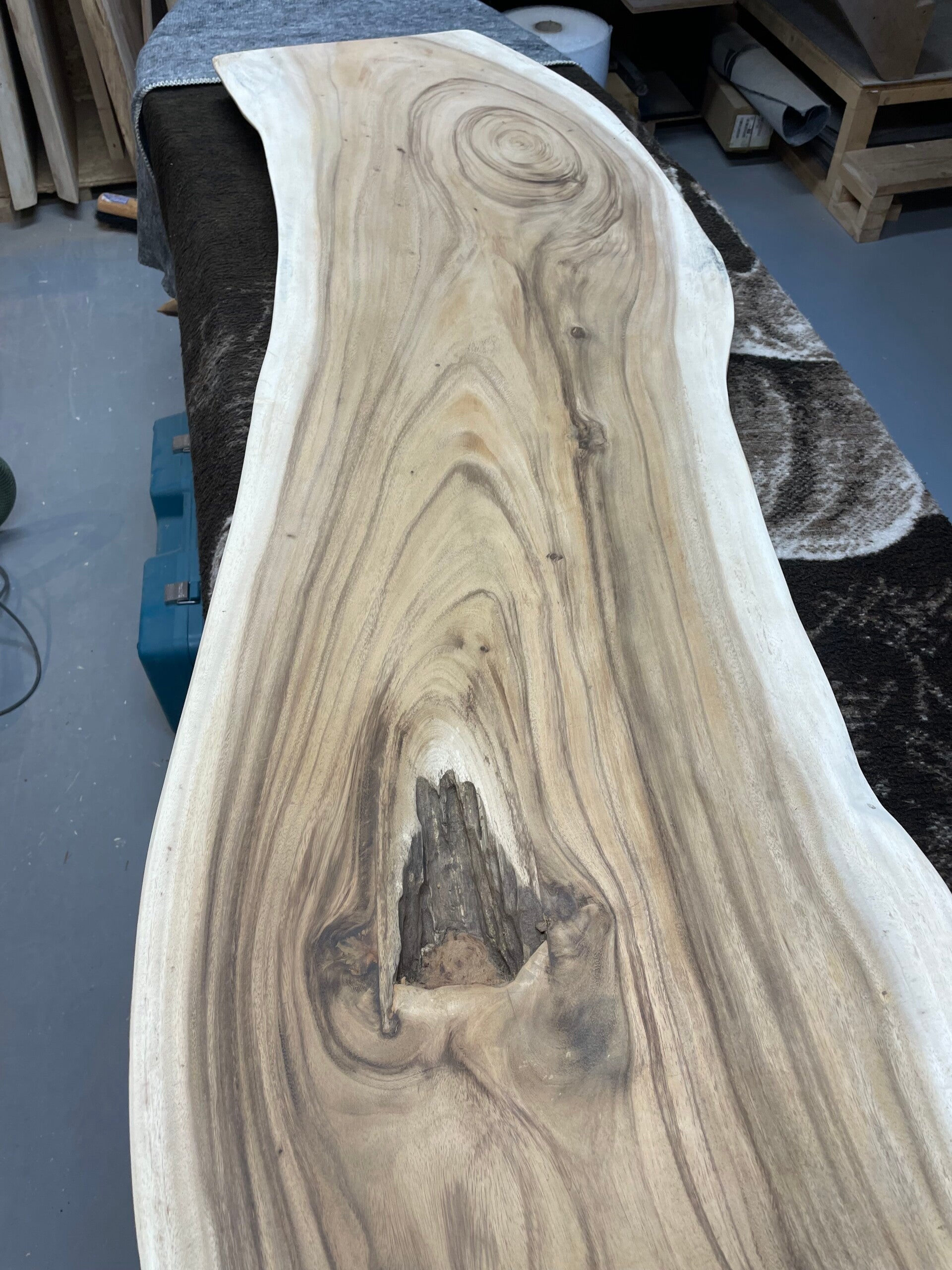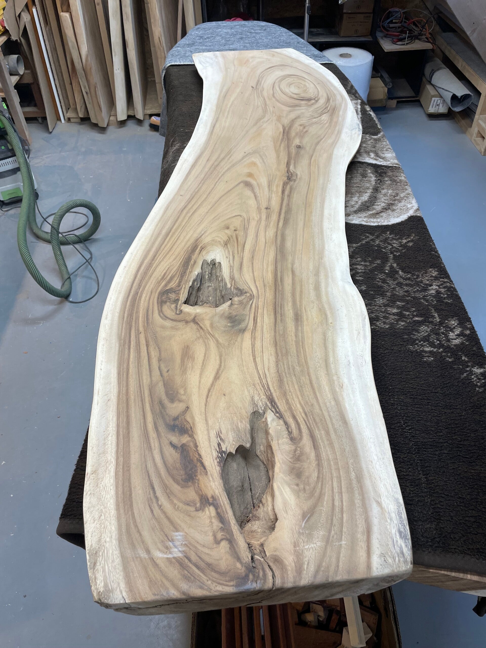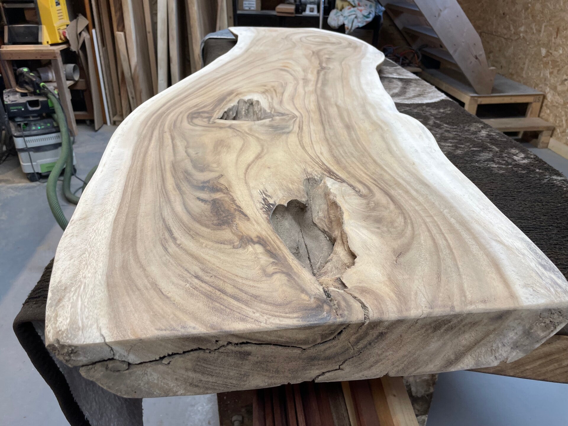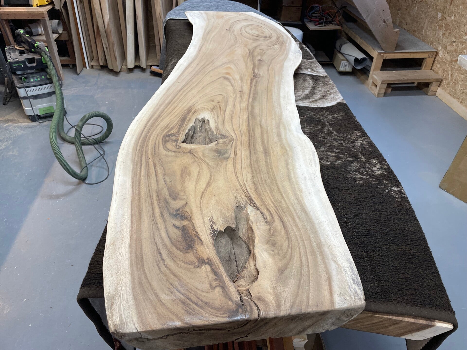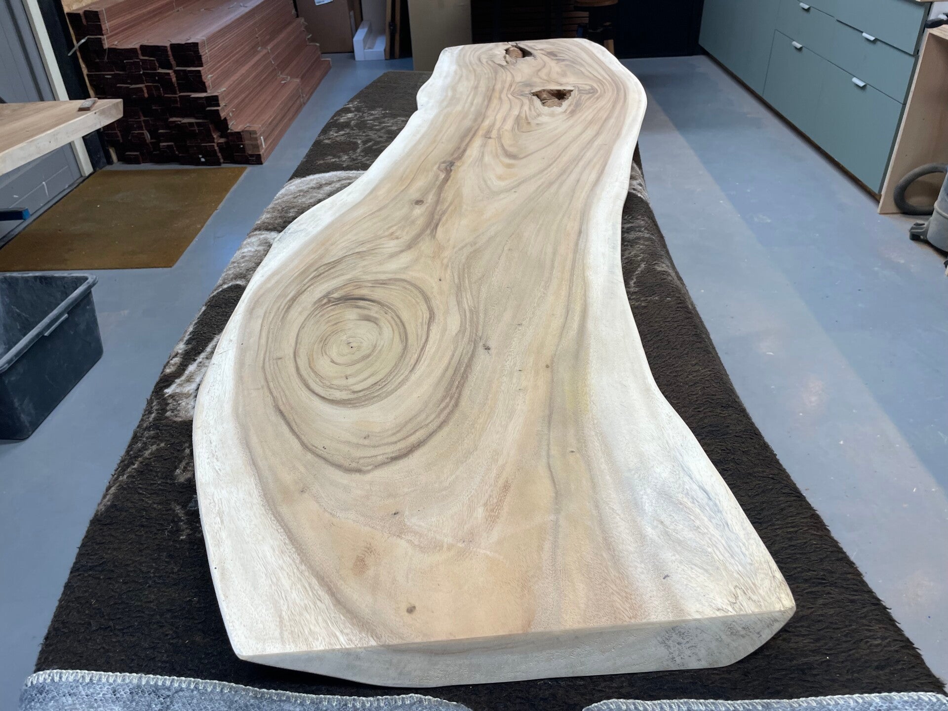 Het blad is fijngeschuurd en spiegelglad, je kunt er zelf nog alle kanten mee op, tafel, bureau, salontafel, sidetable etc.